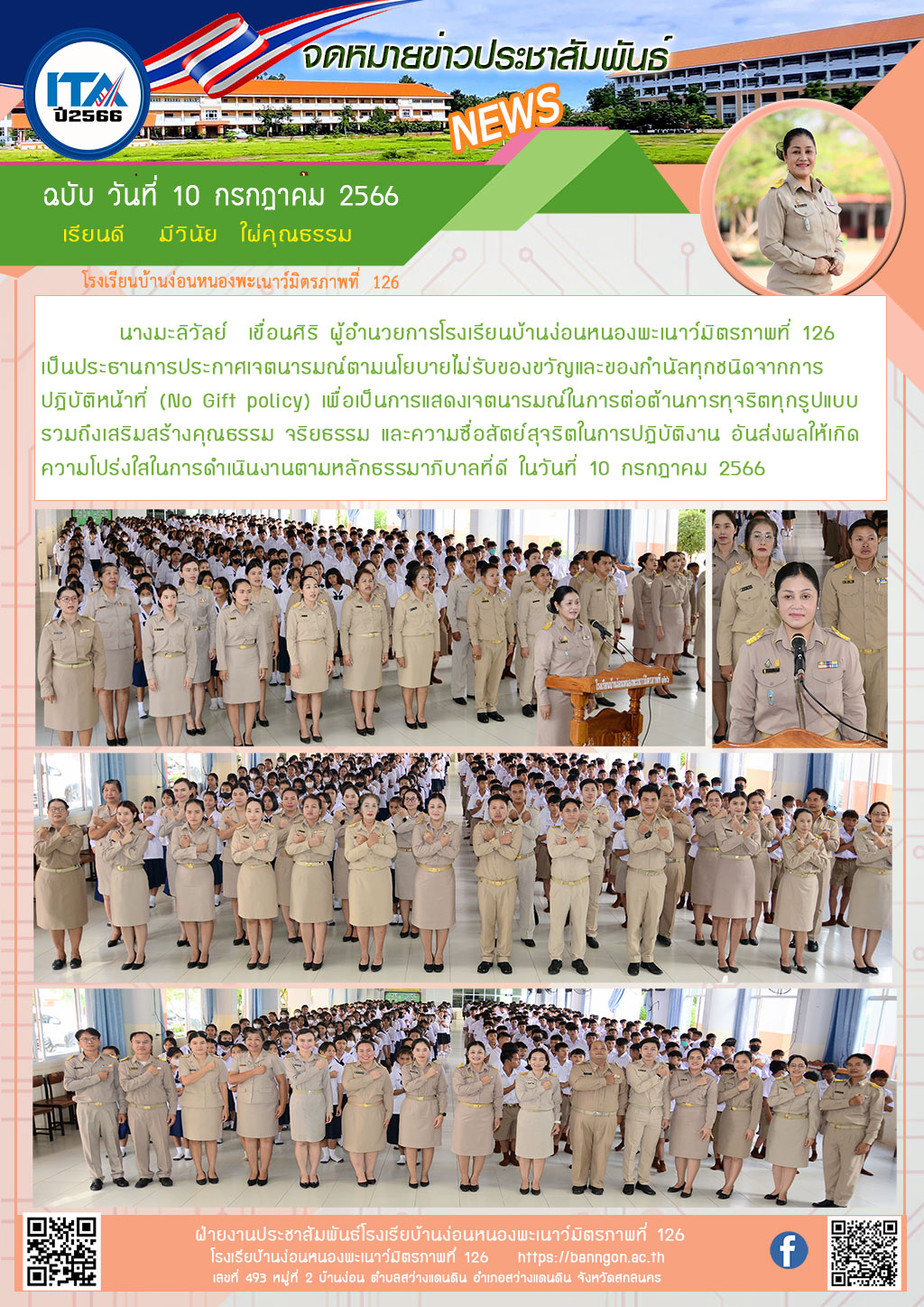 ประกาศเจตนารมณ์โรงเรียนสุจริต โปร่งใส ประจำปี 2566