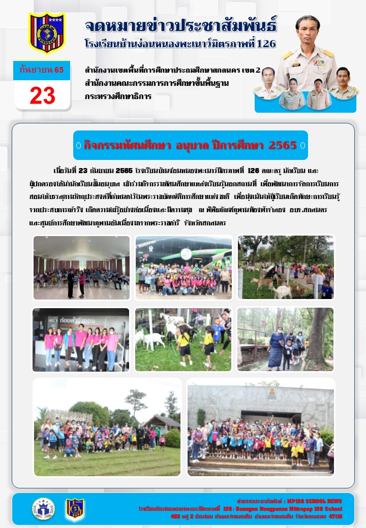 เมื่อวันที่ 23 กันยายน 2565 โรงเรียนบ้านง่อนหนองพะเนาว์มิตรภาพที่ 126 คณะครู นักเรียน และผู้ปกครองได้นำนักเรียนชั้นอนุบาล เข้าร่วมกิจกรรมทัศนศึกษาแหล่งเรียนรู้นอกสถานที่ เพื่อพัฒนาการจัดการเรียนการสอนให้บรรลุตามวัตถุประสงค์ที่กำหนดไว้ในพระราชบัญญัติการศึกษาแห่งชาติ เพื่อมุ่งเน้นให้ผู้เรียนเกิดทักษะการเรียนรู้จากประสบการณ์จริง เกิดความใฝ่รู้อย่างต่อเนื่องและมีความสุข ณ พิพิธภัณฑ์ภูพานท้องฟ้าจำลอง อบจ.สกลนครและศูนย์การศึกษาพัฒนาภูพานอันเนื่องมาจากพระราชดำริ จังหวัดสกลนคร