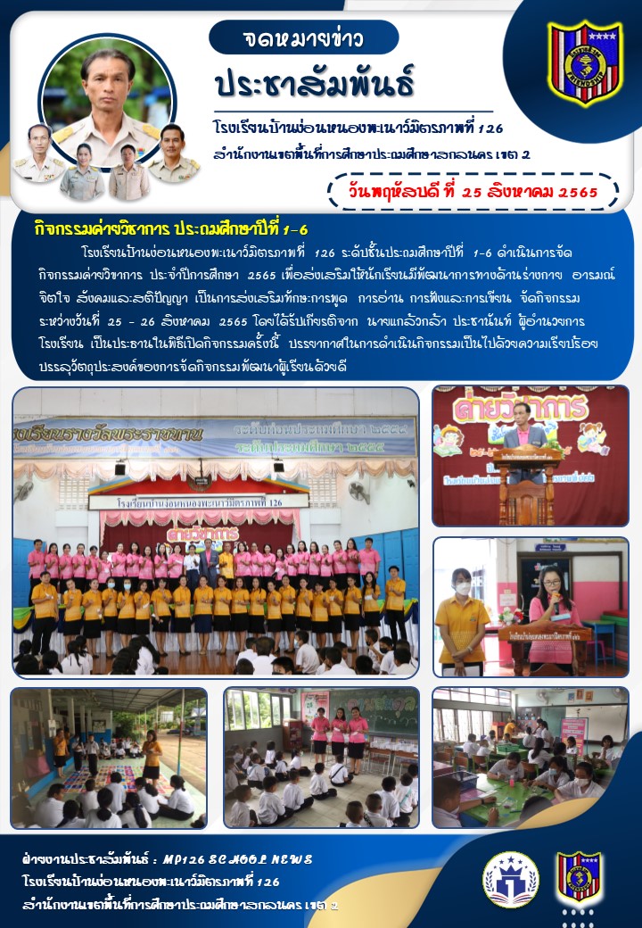 โรงเรียนบ้านง่อนหนองพะเนาว์มิตรภาพที่ 126 ระดับชั้นประถมศึกษาปีที่ 1-6 ดำเนินการจัดกิจกรรมค่ายวิขาการ ประจำปีการศึกษา 2565 เพื่อส่งเสริมให้นักเรียนมีพัฒนาการทางด้านร่างกายอารมณ์ จิตใจ สังคมและสติปัญญา เป็นการส่งเสริมทักษะการพูด การอ่าน การฟังและการเขียน จัดกิจกรรมระหว่างวันที่ 25 - 26 สิงหาคม 2565 โดยได้รับเกียรติจาก นายแกล้วกล้า ประชานันท์ผู้อำนวยการโรงเรียน เป็นประธานในพิธีเปิดกิจกรรมครั้งนี้ บรรยากาศในการดำเนินกิจกรรมเป็นไปด้วยความเรียบร้อย บรรลุวัตถุประสงค์ของการจัดกิจกรรมพัฒนาผู้เรียนด้วยดี